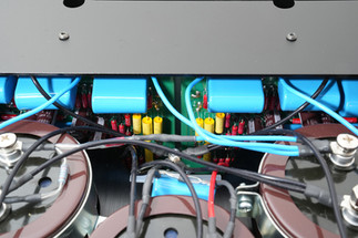 我看拍攝的照片,我感覺放大器是雙層架構,據廠方的資料,總共用了 3 個變壓器,為左、右聲道線路獨立供電,估計變壓器都是收藏在最底部,因我看表層佈滿了電容,實際這 12 支電容,每一支的容量是120,000µF,製造商和成份到底是銀薄膜抑或純銅,這方面我找不到資料,我只能說以眼前的陣容作為唱放,肯定不用顧慮聲音質素 !