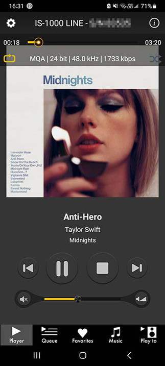 由於Gold Note IS-1000 MKII能夠在網絡音樂串流時對應MQA音檔,因此亦特別聆聽了不少這方面的數碼音樂檔案,包括Adele著重強弱變化地演唱占士邦電影主題曲〈Skyfall〉、Taylor Swift分別在《Red》和《Midnights》唱片中的感性演繹,每首作品都能夠透過IS-1000 MKII以豐盈訊息量突顯作品的獨有特色,感人肺腑地把歌者個性化演繹和精彩編曲下的樂手演奏,全部盪氣迴腸地透徹反映。不過必須留意若以CD雷射唱盤輸入MQA數碼訊號的話,則未能收效,唯獨由於今次所用一部以真空管作緩衝的Triode雷射唱盤本身備有MQA解碼功能,因此重播MQA CD時以Triode率先對此作出MQA解碼程序,然後再以模擬輸出連上IS-1000 MKII相關輸入,同樣可以藉此幫助發揮MQA CD的高解析力音樂重播效果,可見備有多種輸入功能的IS-1000 MKII實用性強,重播效果亦佳,能夠滿足不同音樂重播需要。