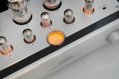 今次所用的LM-606IA在前級部分採用一支捷克JJ製ECC83S(12AX7)和印有Line Magnetic字樣的兩支12AU7,配合的推動管則採用不少經典AB類推挽式放大器都喜歡使用的12BH7推動管,而測試中的這部LM-606IA所用兩支12BH7是俄羅斯製Electro Harmonix