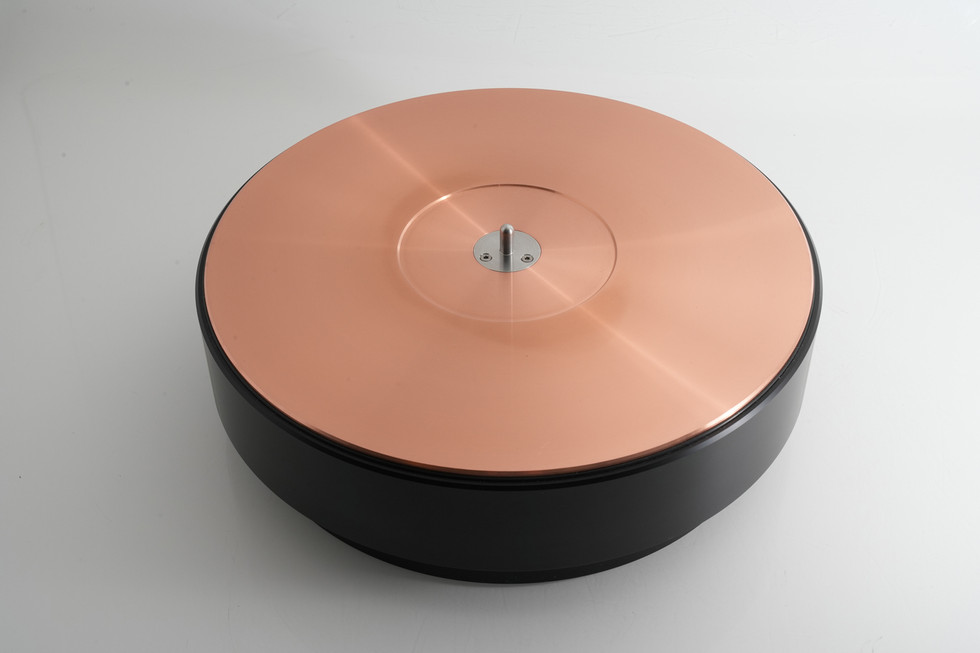 Raven LS的20mm厚鋁合金長橢圓形臂板是廠方的新設計,安裝在唱盤基座的那一邊鑽有12個小孔,分別代表由222mm至316.6mm一共12個唱臂的安裝距離(mounting distance),用家手冊除了寫有這12個距離的尺寸之外,旁邊還列明適合安裝那一款唱臂的型號,跟著用一支跟盤而來的鋼針插在適用的小孔,再移動臂板讓鋼針跌進40mm厚不銹鋼臂板安裝台上對應的小孔,跟著再鎖聚臂板螺絲,便會完美固定臂板的安裝位置。如果個別唱臂的安裝距離並不在這12個小孔之列,用家也可以自行用尺量度後再鎖緊螺絲便成。至於不同品牌唱臂有不同的臂板開孔這個複雜的難題,廠方有一個巧妙的辦法來解決 —— 在臂板的另一端開了一個直徑70mm的大圓孔,內裡套上一個用CNC車製得非常準確,可以替換的不銹鋼圓板,用家可以向廠方預訂適合自己唱臂使用的圓板,如果要更換唱臂,只要訂多一塊準確開孔的圓板換上去便可以,無需再買多一塊臂板。當然,如果像我們一樣要同時安裝兩支唱臂,那便要買多一塊臂板來安裝了。Raven LS除了原裝的設置之外,還有兩項升級的選擇。其一是加多一個內置兩隻頂級直流馬達和一份精準同步操控線路模組的鋁合金外置機箱,只要把這個機箱用三支長螺絲鎖緊在基座背板預設的位置,再換上一條長膠帶,Raven LS便會搖身一變成為三摩打驅動的唱盤,音效的提升立竿見影。另一項升級是把轉盤換成旗艦Raven Black Night級數的重量級轉盤,實芯銅頂板加厚至40mm,下層依舊是聚甲醛塑料,重量亦大幅增加至23kg,重播音效的提升同樣是無可置疑,不過今次我們試聽的Raven LS只是升級至三馬達驅動版本。